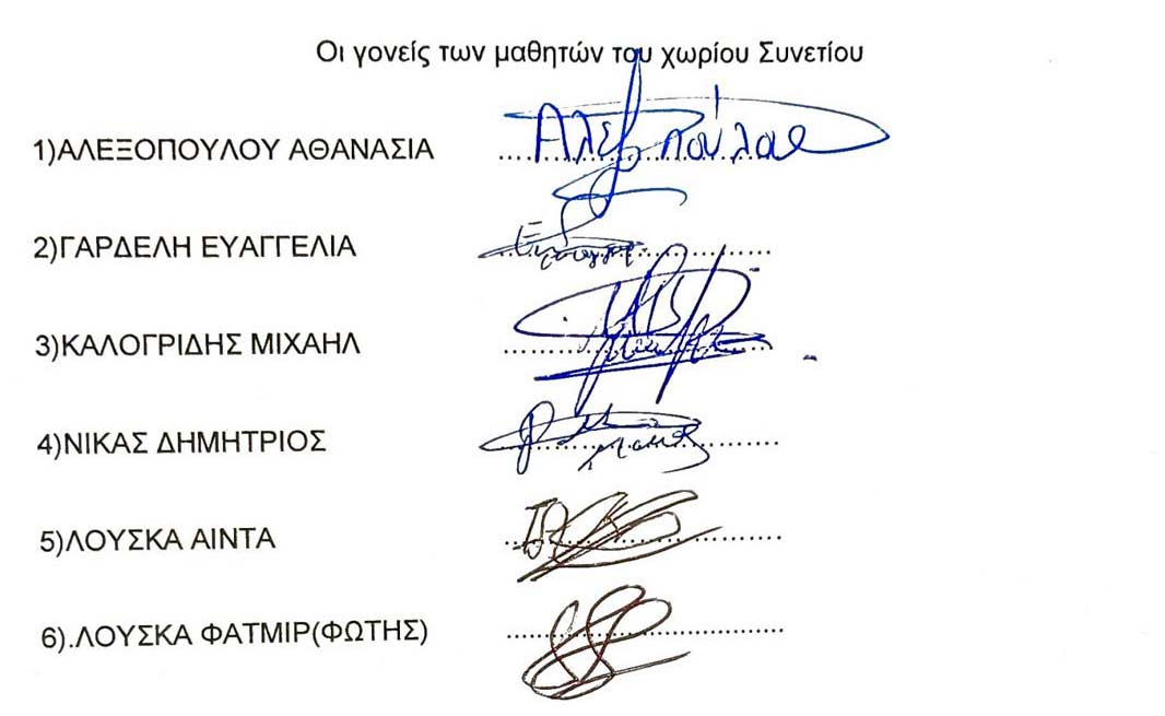 Οι γονείς των μαθητών του χωριού Συνετί: 1) Αλεξοπούλου Αθανασία, 2) Γαρδέλη Ευαγγελία, 3) Καλογρίδης Μιχαήλ 4) Νίκας Δημήτριος, 5) Λούσκα Αίντα, 6) Λούσκα Φατμίρ (Φώτης)