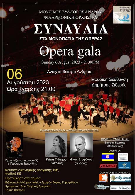 Η Φιλαρμονική του ΜΟΥ.Σ.Α., πιστή στο καλοκαιρινό της ραντεβού, σας προσκαλεί στη συναυλία- αφιέρωμα στα 100 χρόνια από τη γέννηση της «Μαρίας Κάλλας» με τίτλο «Στα μονοπάτια της Όπερας», την Κυριακή, 6 Αυγούστου 2023, στις 21.00, στο Ανοιχτό Θέατρο Άνδρου, στο πλαίσιο του 9 ου Διεθνούς Φεστιβάλ Άνδρου.