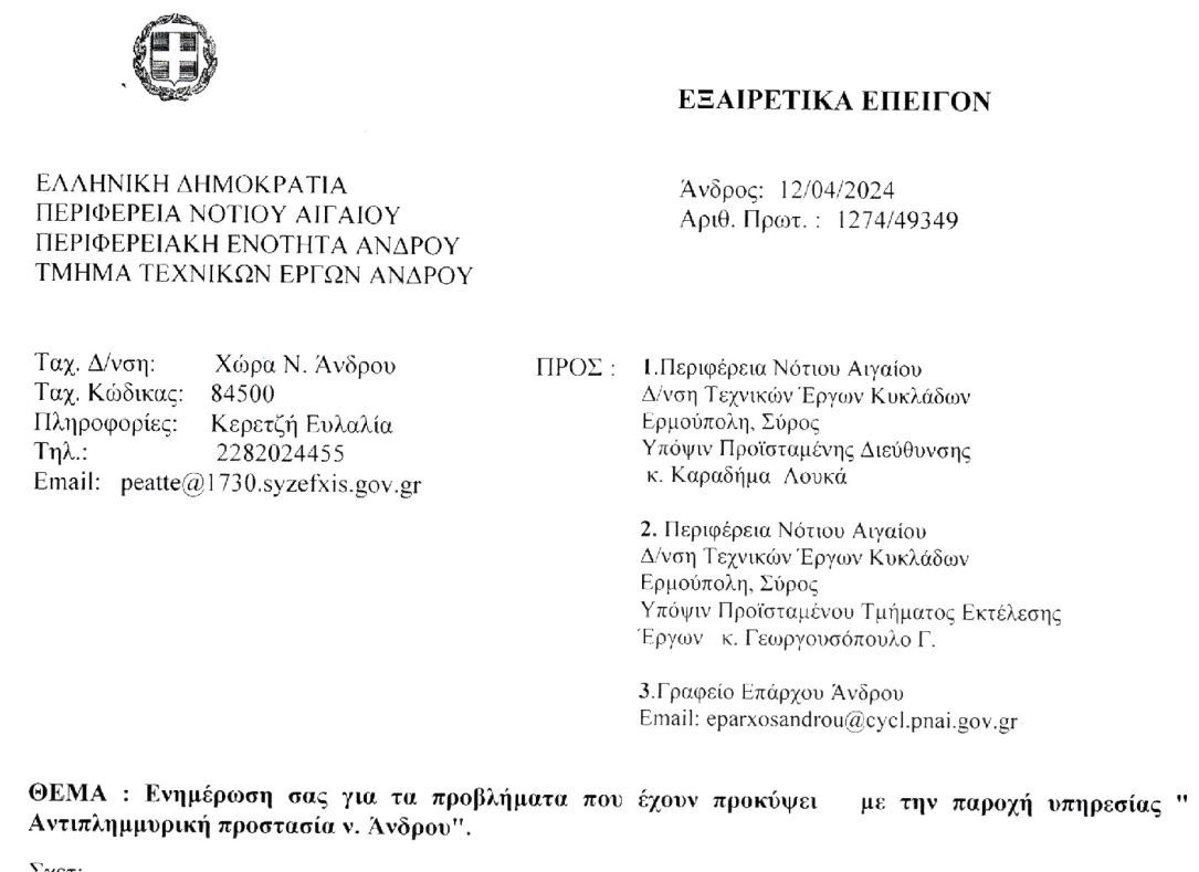 Παραθέτω έγγραφο όπως μου εστάλει από το Τμήμα Τεχνικών Έργων ‘Ανδρου της Περιφερειακής Ενότητας Άνδρου προς ενημέρωση κάθε ενδιαφερόμενου.
