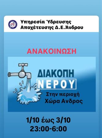 ****Σας ενημερώνουμε ότι διακοπή ύδρευσης θα γίνετε στην Χώρα κάθε βράδυ 23:00-6:00 από 1/10 έως και 3/10.
