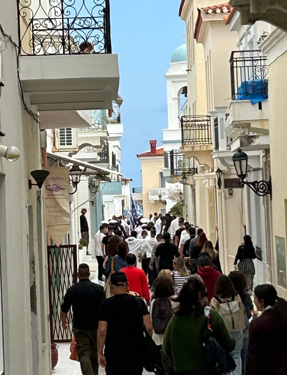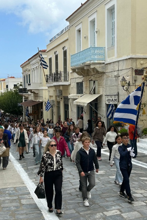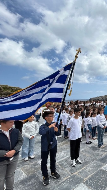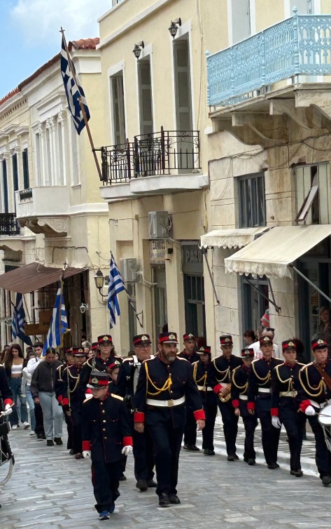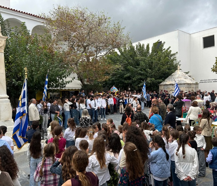 Τα εμβατήρια του ΜΟΥΣΑ συνόδευαν τα βήματα των μαθητών και αντηχούσαν στη Χώρα, μεταφέροντας το μήνυμα της εθνικής επετείου σε κάθε γωνιά. Ήταν σαν η μουσική να έδινε φωνή στους ήρωες του ’40 και να συνομιλούσε με τη νέα γενιά που κρατά τη σημαία ψηλά. Για λίγο, το παρελθόν και το παρόν έγιναν ένα, τα παιδιά του σήμερα ένωσαν τη φωνή τους με τους αγωνιστές του τότε, μεταφέροντας το μήνυμα πως η ελευθερία, η δημοκρατία και η ειρήνη είναι αξίες που πρέπει πάντα να φυλάσσονται.