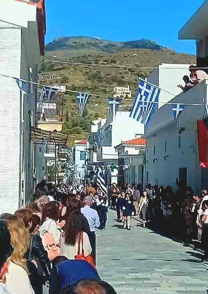Η παρέλαση ξεκίνησε μέσα σε χειροκροτήματα και ενθουσιασμό, με τον ΜΟΥΣΑ να παιανίζει εμβατήρια. Η Χώρα έλαμπε, όχι μόνο από τον ήλιο του φθινοπώρου, αλλά κυρίως από τα φωτεινά πρόσωπα των παιδιών που κρατούσαν τη σημαία ψηλά. Το ίδιο συγκινητικό κλίμα επικράτησε και στις παρελάσεις που πραγματοποιήθηκαν σε Κόρθι, Μπατσί και Γαύριο.