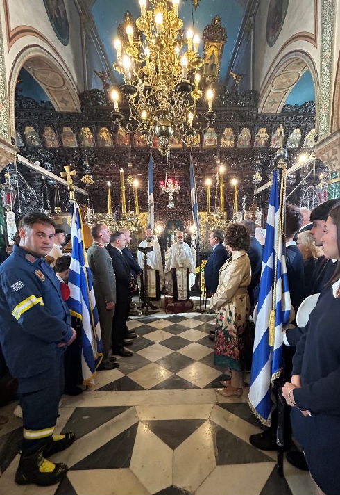 Η ημέρα, στη Χώρα, ξεκίνησε με τη συγκέντρωση των επισήμων στο Δημαρχείο, όπου ο Δήμαρχος Άνδρου και τα μέλη της Δημοτικής Αρχής υποδέχθηκαν τις αρχές του νησιού. Ακολούθησε η Δοξολογία στον Ιερό Ναό Αγίου Γεωργίου. Η εκκλησία γέμισε με μαθητές, εκπαιδευτικούς, γονείς και πολίτες που ένωσαν τις φωνές τους στην προσευχή για ειρήνη και ενότητα.