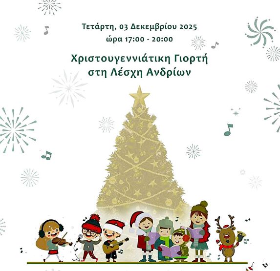 Όπως κάθε χρόνο, έτσι και φέτος η Λέσχη Ανδρίων διοργανώνει μια Χριστουγεννιάτικη Γιορτή για τον στολισμό του δέντρου της, την Τετάρτη 03 Δεκεμβρίου 2025.