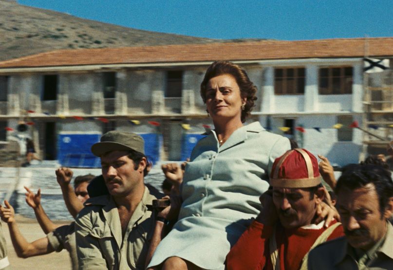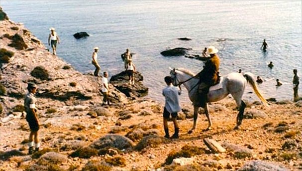 Ο σκηνοθέτης Παντελής Βούλγαρης με τους συνεργάτες του στο καΐκι μπροστά στη Μακρόνησο, κάτω δεξιά καθιστός ο Διονύσης Σαββόπουλος