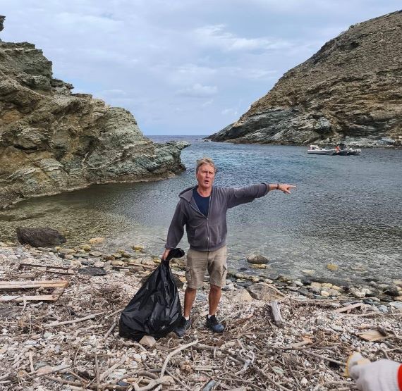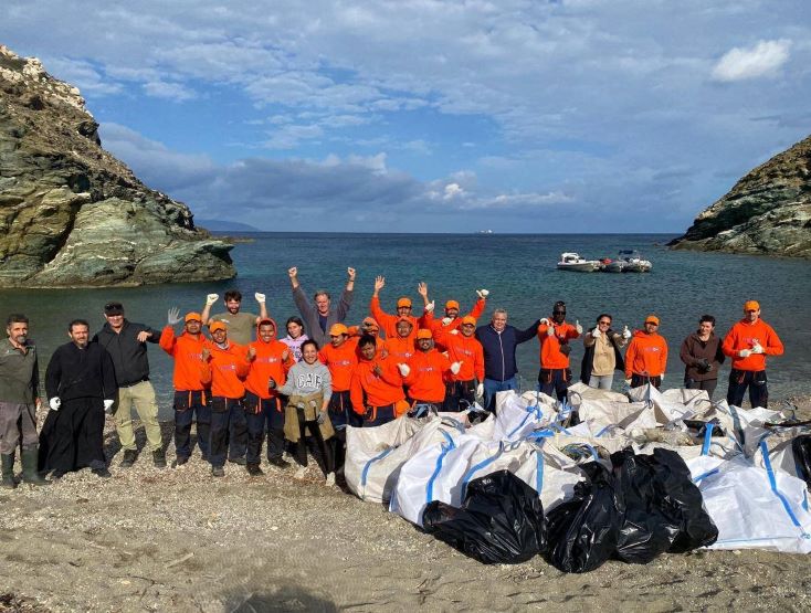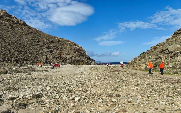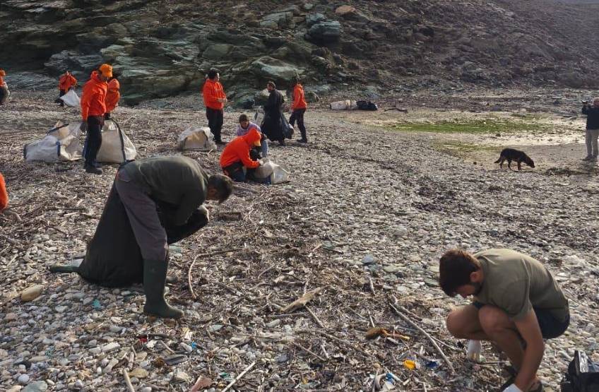 Οι εθελοντές, μαζί με το πλήρωμα του «Τυφώνα», συνέλεξαν πολλά σακιά big-bags, τα οποία μεταφέρθηκαν με ταχύπλοα στο πλοίο.