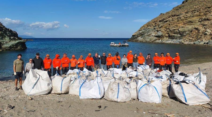 Οι εθελοντές, μαζί με το πλήρωμα του «Τυφώνα», συνέλεξαν πολλά σακιά big-bags, τα οποία μεταφέρθηκαν με ταχύπλοα στο πλοίο.