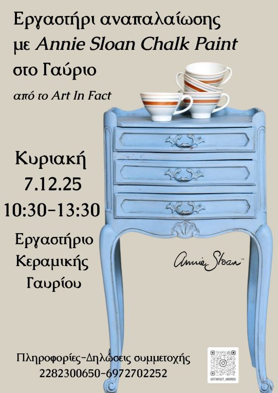 Το εργαστήριο διοργανώνει το Art In Fact, εκπρόσωπος των αυθεντικών χρωμάτων κιμωλίας Annie Sloan Chalk Paint στην Άνδρο, που βρίσκεται στη Χώρα.