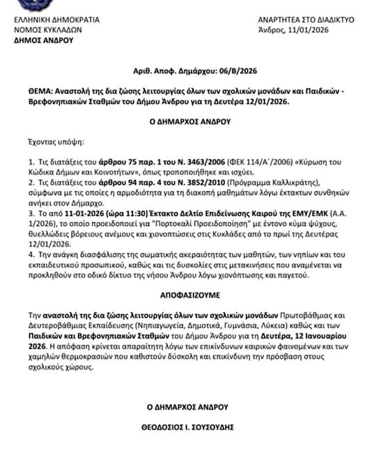Με απόφαση του Δημάρχου Άνδρου, σήμερα Δευτέρα 12/01/2026, τα σχολεία όλων των βαθμίδων, σε όλη την Άνδρο, θα παραμείνουν κλειστά.