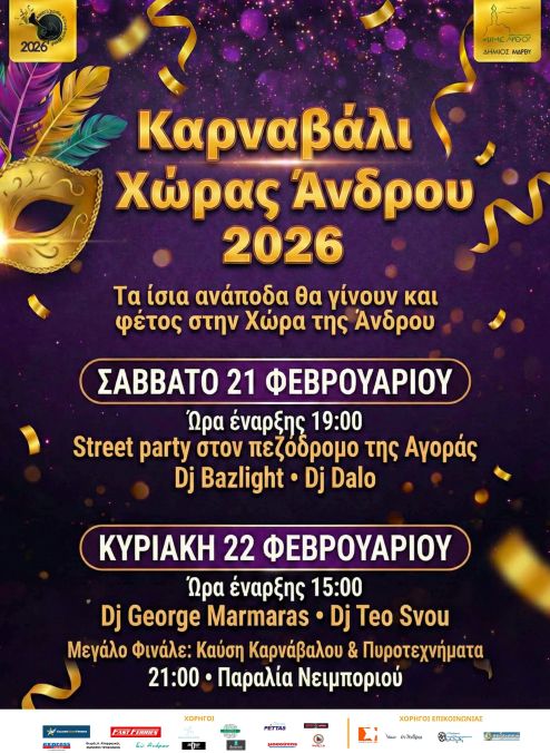 Από τη Χώρα μέχρι το Βαρίδι, από τα μεγάλα δρώμενα μέχρι τα μικρά αποκριάτικα γλέντια των χωριών, όλη η Άνδρος γίνεται μια σκηνή χαράς. Μια σκηνή όπου πρωταγωνιστής είναι ο άνθρωπος. Η Αποκριά στην Άνδρο είναι μια υπόσχεση συνέχειας. Είναι γέφυρα ανάμεσα στο χθες και το σήμερα. Είναι πολιτισμός, μνήμη, ταυτότητα και ελπίδα μαζί. Και κάθε φορά που τα πρόσωπα φωτίζονται και τα γέλια γεμίζουν τους δρόμους, η Άνδρος θυμάται ποια είναι, ένα νησί που ξέρει να ενώνεται, να δημιουργεί και να γιορτάζει τη ζωή σε όλες τις εκφάνσεις.