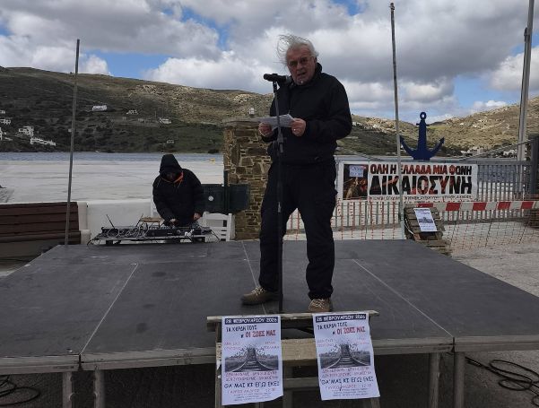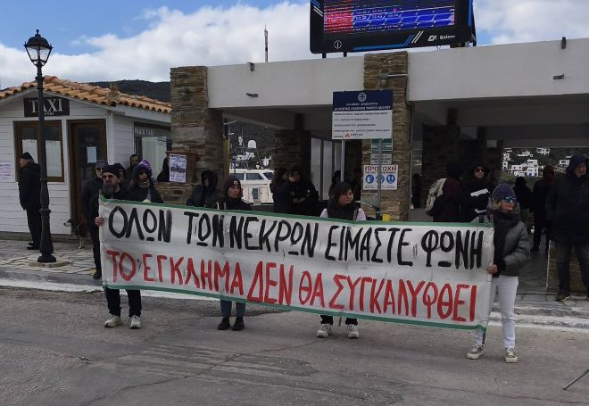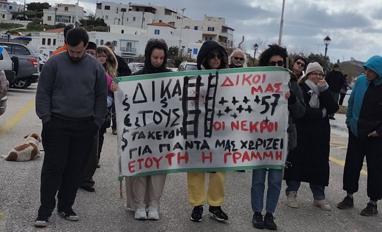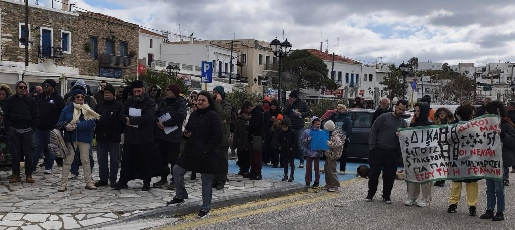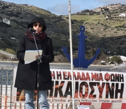 Παρόλο την παγωμένη ατμόσφαιρα και τον δυνατό αέρα, πάνω από 150 άτομα συγκεντρώθηκαν στο λιμάνι Γαυρίου, διαδηλώνοντας για να τιμήσουν τους αδικοχαμένους επιβάτες των τρένων.