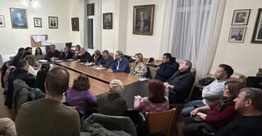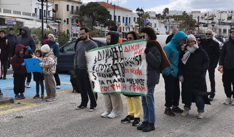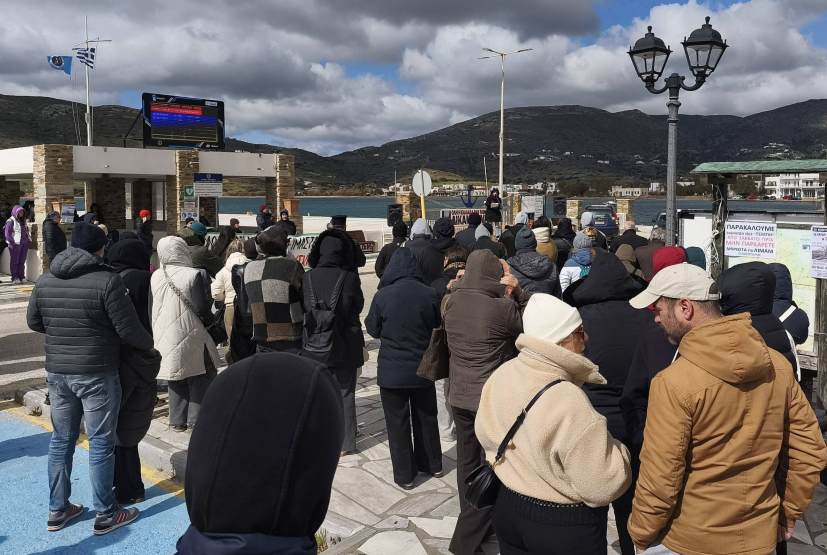 Παρόλο την παγωμένη ατμόσφαιρα και τον δυνατό αέρα, πάνω από 150 άτομα συγκεντρώθηκαν στο λιμάνι Γαυρίου, διαδηλώνοντας για να τιμήσουν τους αδικοχαμένους επιβάτες των τρένων.