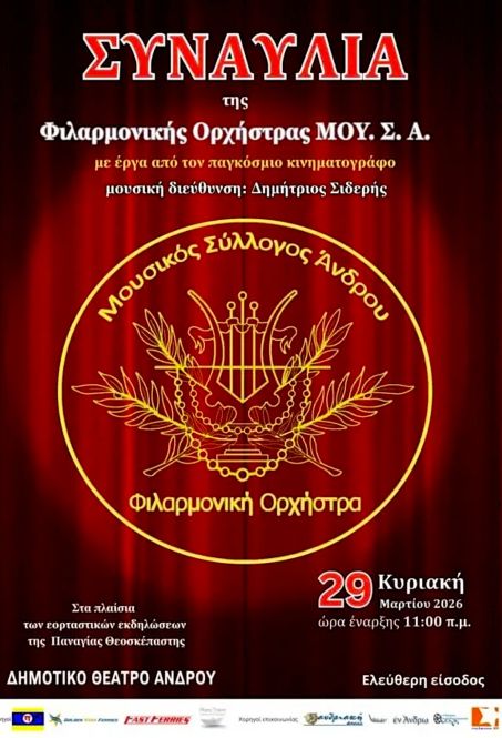 ώρα 11:00 Συναυλία Φιλαρμονικής στο Δημοτικό Θέατρο Άνδρου.